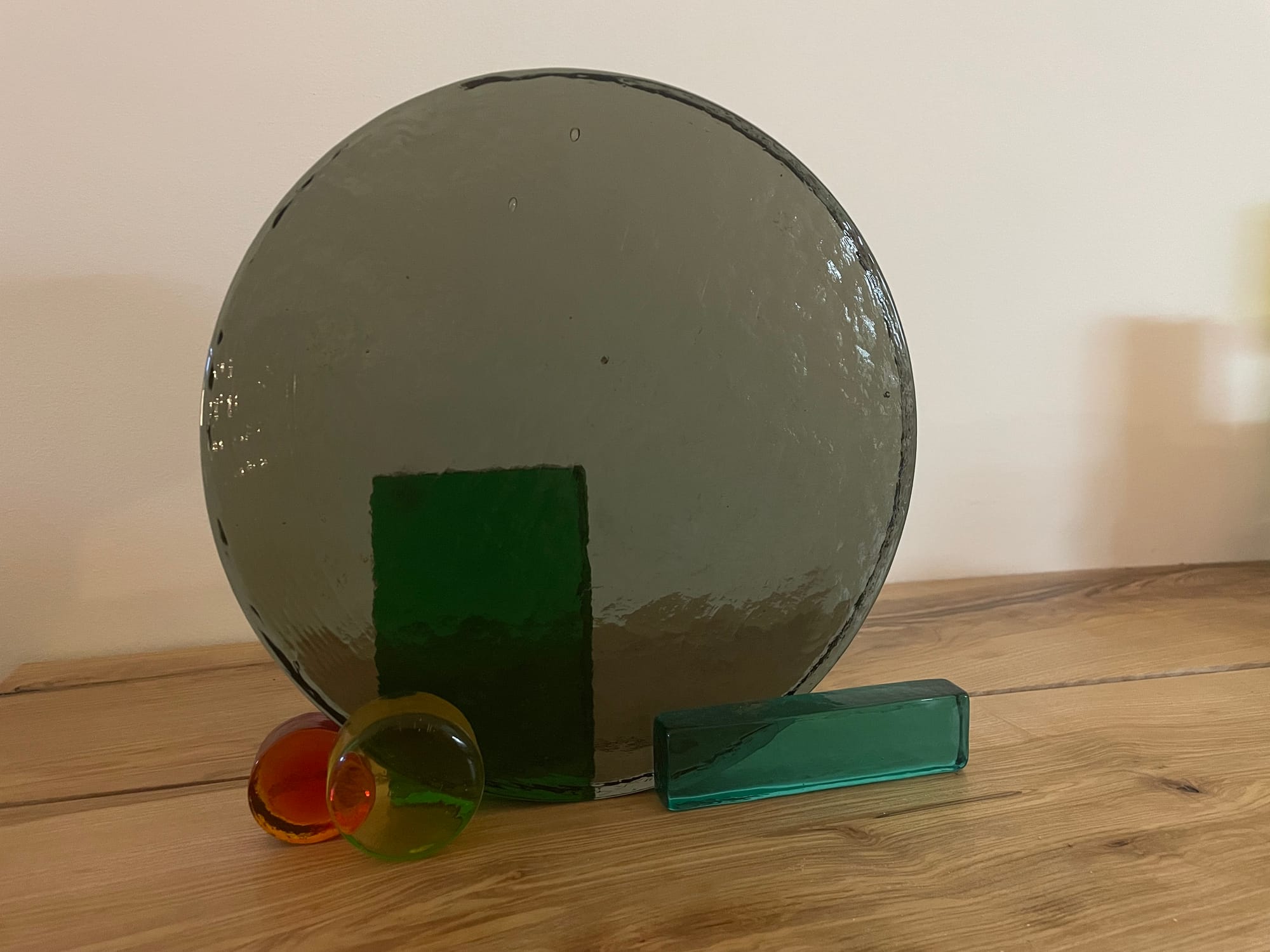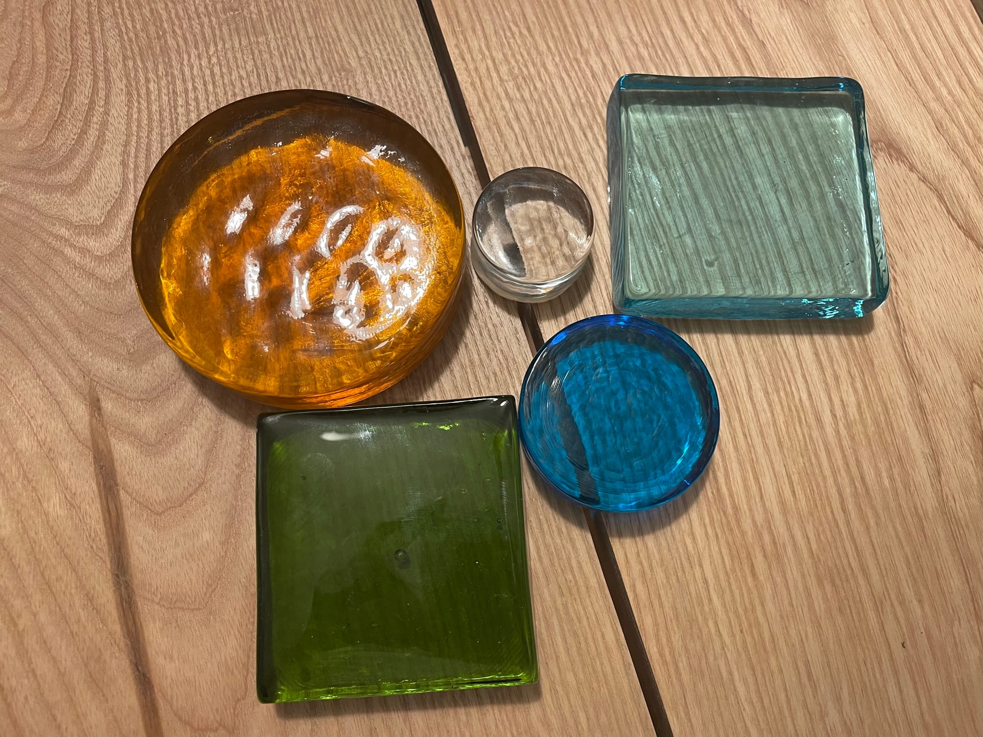 Both the Budleigh googly eyed stones and Max Lamb's boulders are simple, wafer thin ideas, even if the execution of the latter was far from easy. And I mean that as an enthusiastic and envious endorsement. Perhaps inspired by both, on returning to London I was keen to pick up an side-project that never really got beyond the initial proof of concept. A few years ago I bought a small collection of coloured glass shapes. Here are a few examples.